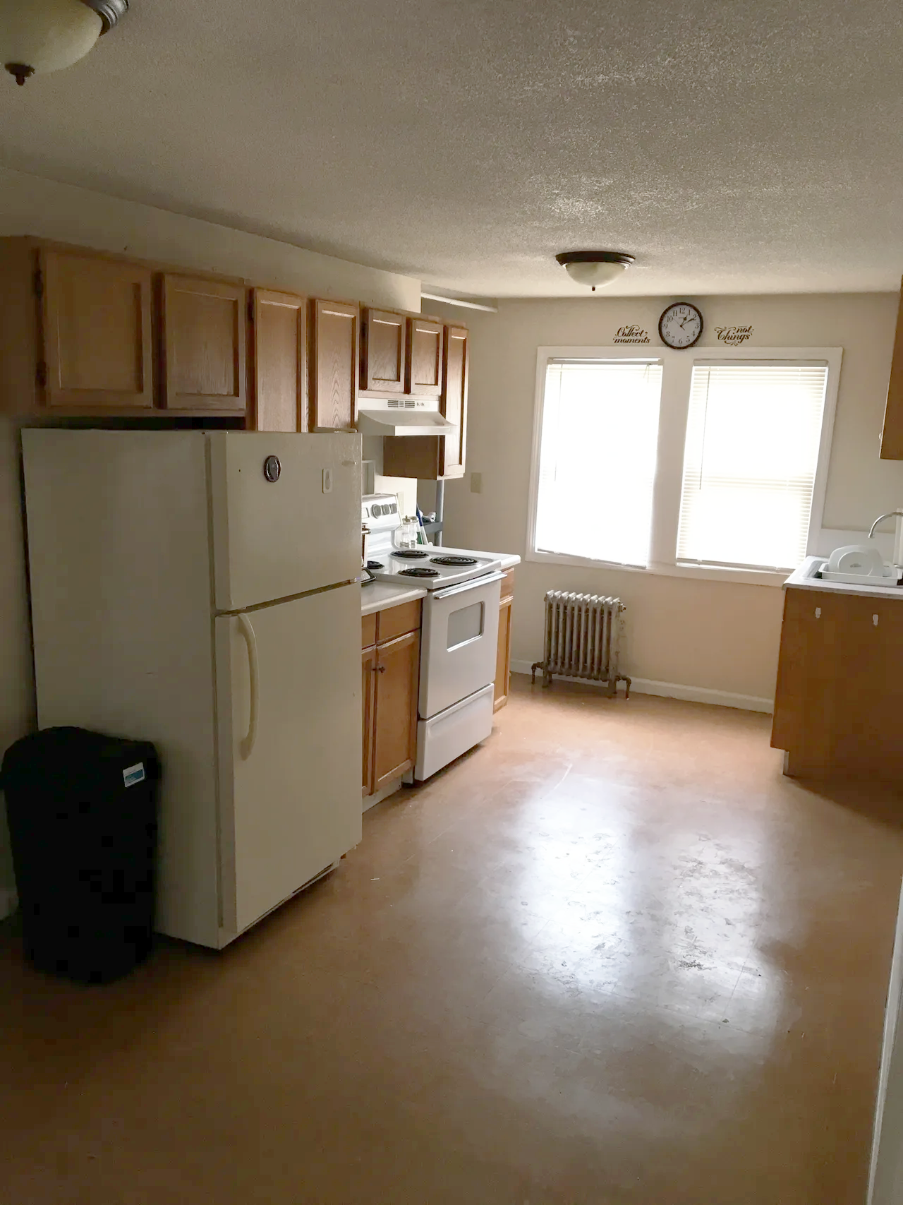 A kitchen with wooden cabinets, a white refrigerator, a white stove, a white sink, and a window with blinds. There is a wall clock and decorative wall hangings above the window.