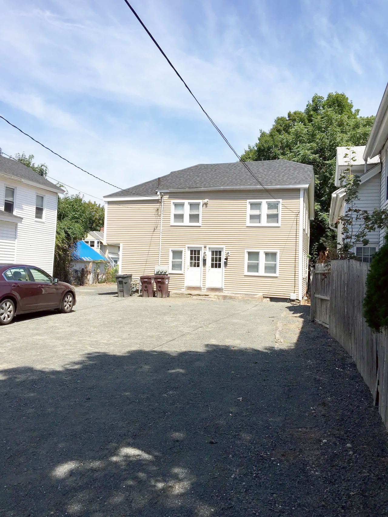 A beige three-story house with white trim and a gray roof, surrounded by a gravel lot with a few trash cans and a parked maroon car in front, under a clear blue sky with some wispy clouds.