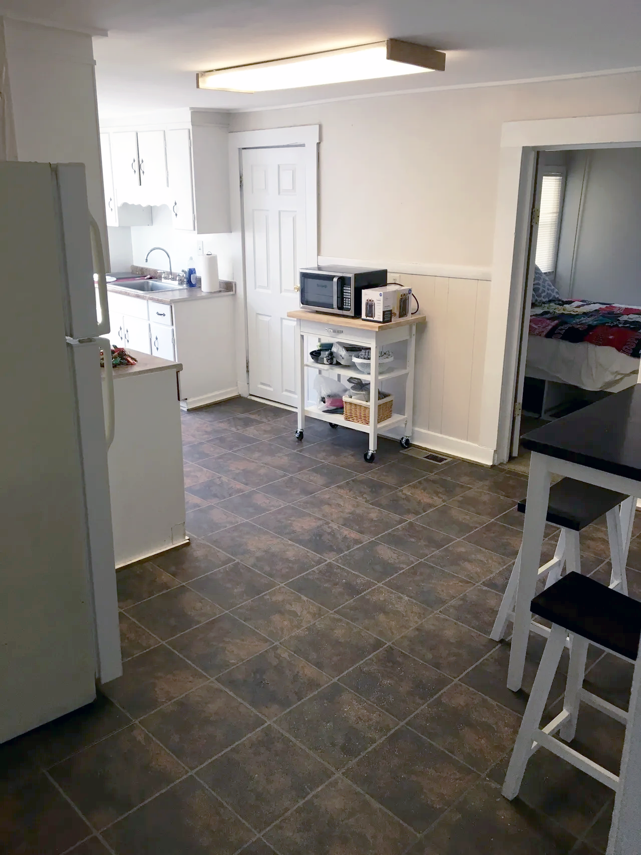Empty kitchen with white cabinets, a refrigerator, a microwave on a white cart, and a bedroom visible through an open doorway.