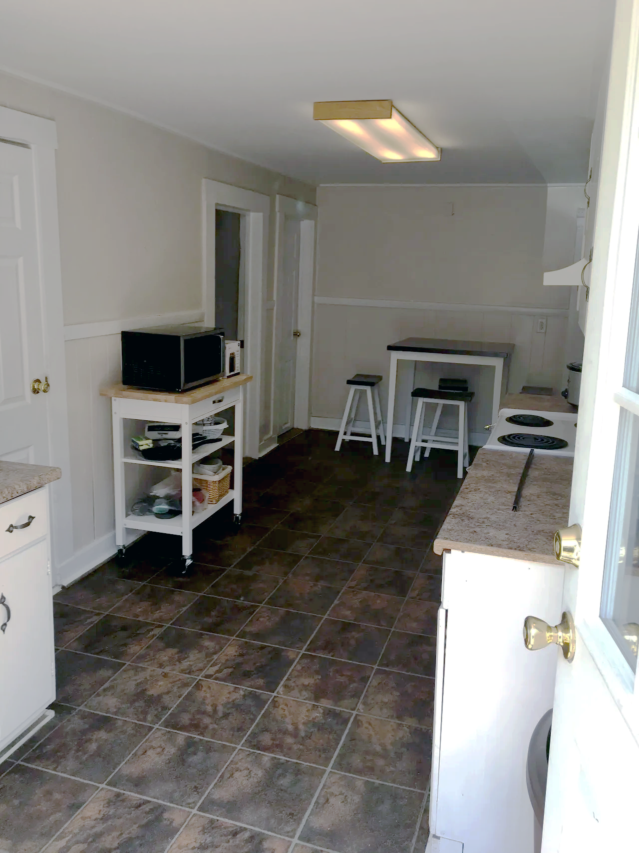 Empty kitchen with white cabinets, a small table with two stools, and a small black microwave on a white cart.