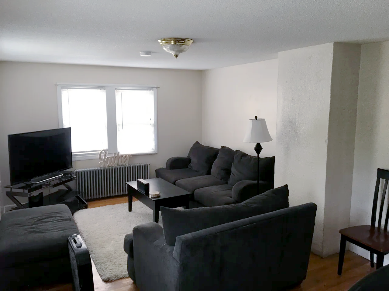 Living room with a black sofa, a TV on a stand, a window with blinds, a standing lamp, a white rug, and a sign that says 'GATHER' near the window.