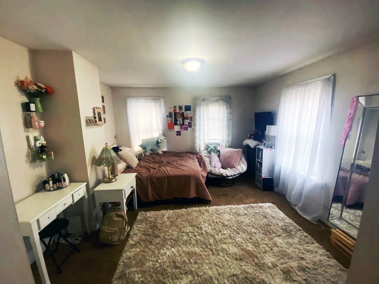 Living room with a bed, small table with a lamp, plush shaggy rug, a window with curtains, a mirror, a TV, and various decorations including pillows and a stuffed animal.