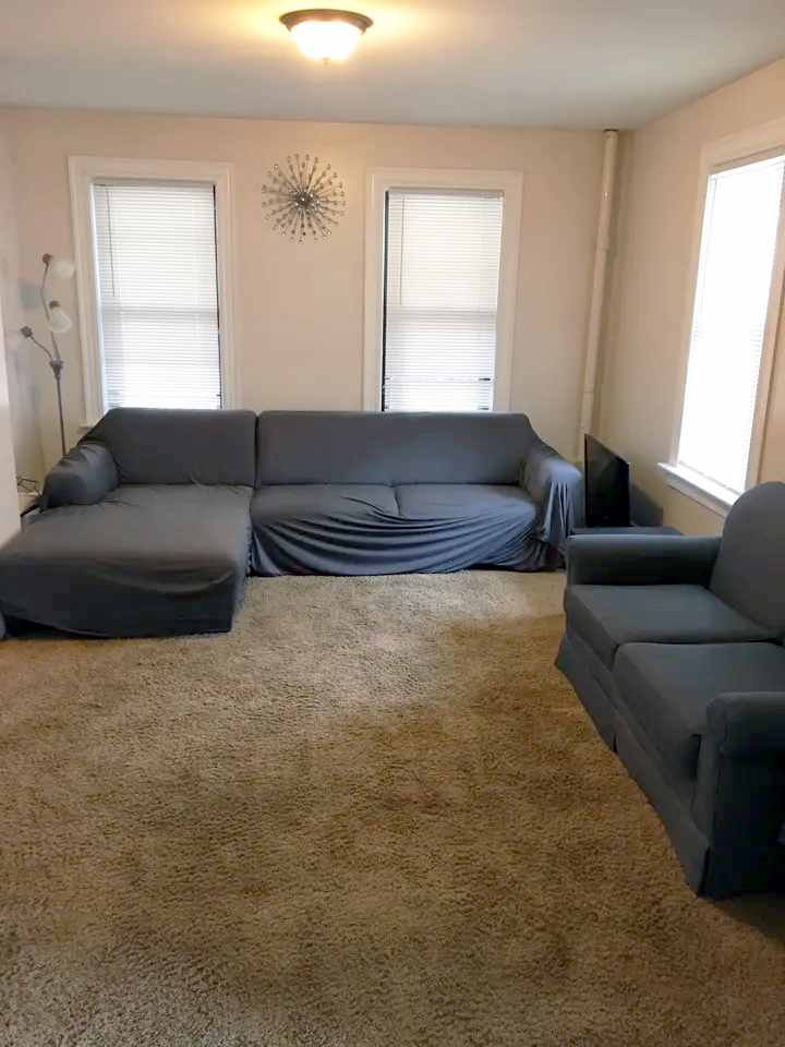 Living room with beige carpet, a gray L-shaped sofa covered with a slipcover, a gray armchair, three windows with blinds, a round wall clock, a floor lamp, and a small TV.