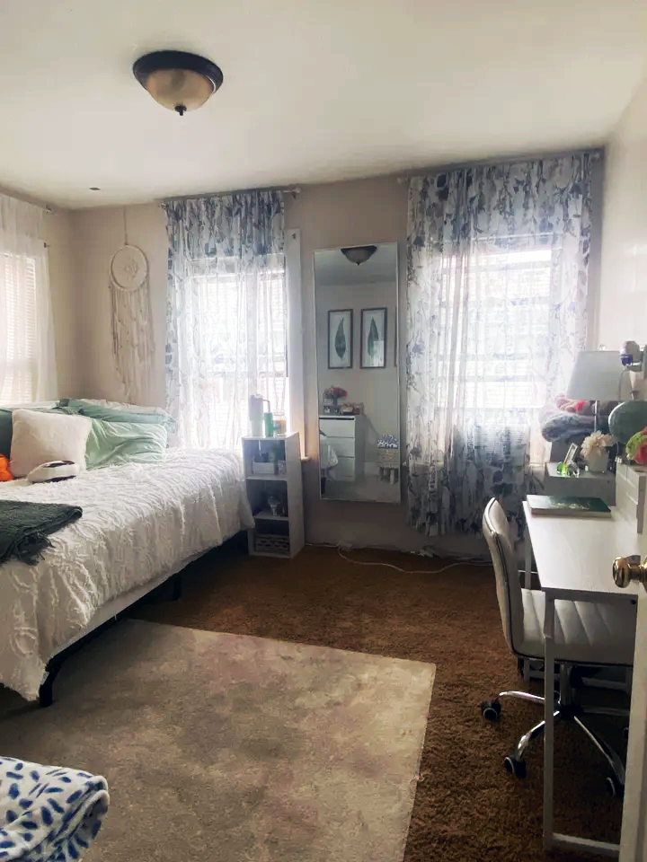 A bedroom with a bed on the left side, a mirror in the center, and a desk with a chair on the right side, with windows and curtains in the background.