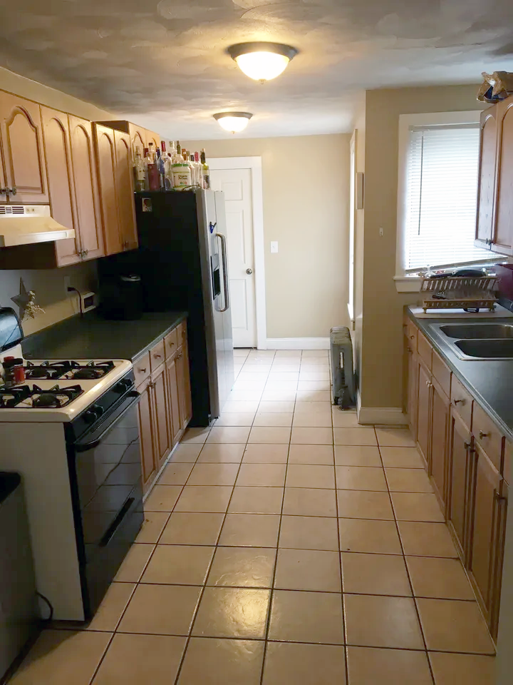 A kitchen with wooden cabinets, a black refrigerator topped with liquor bottles, a stove, a sink with dish drying racks, tiled floor, and a window with blinds.