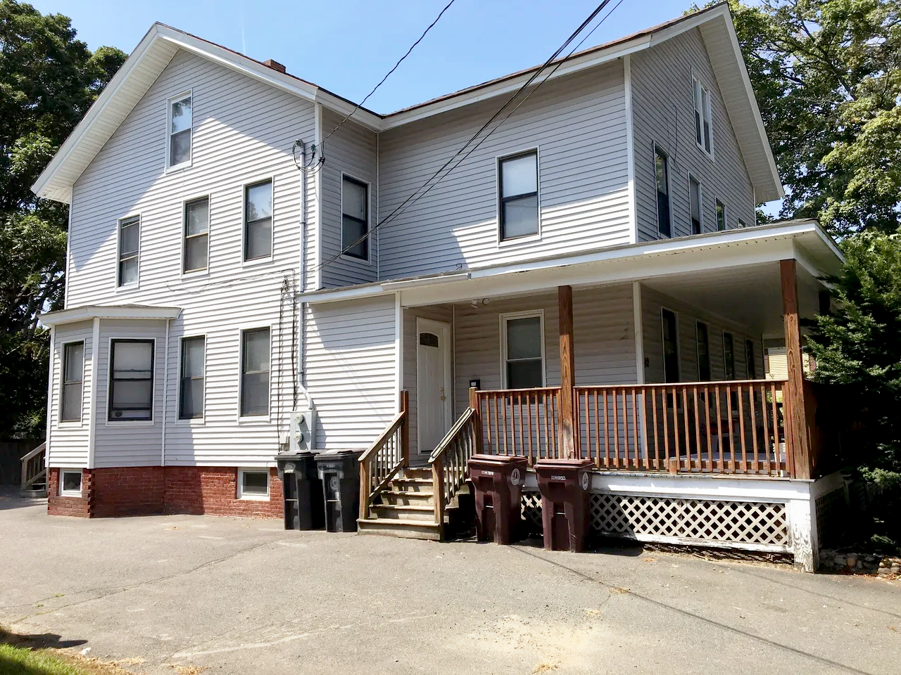 A three-story white house with a porch, multiple windows, and a sloped roof, surrounded by trees and a paved driveway with trash bins.