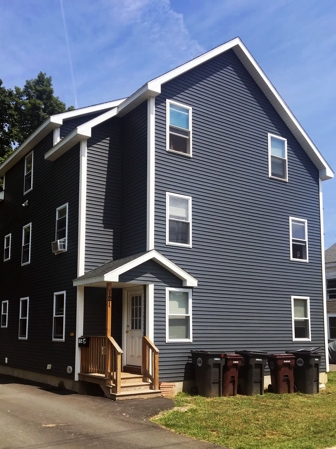 A three-story house with dark blue siding, white trim, and a small front porch with a wooden railing and steps.