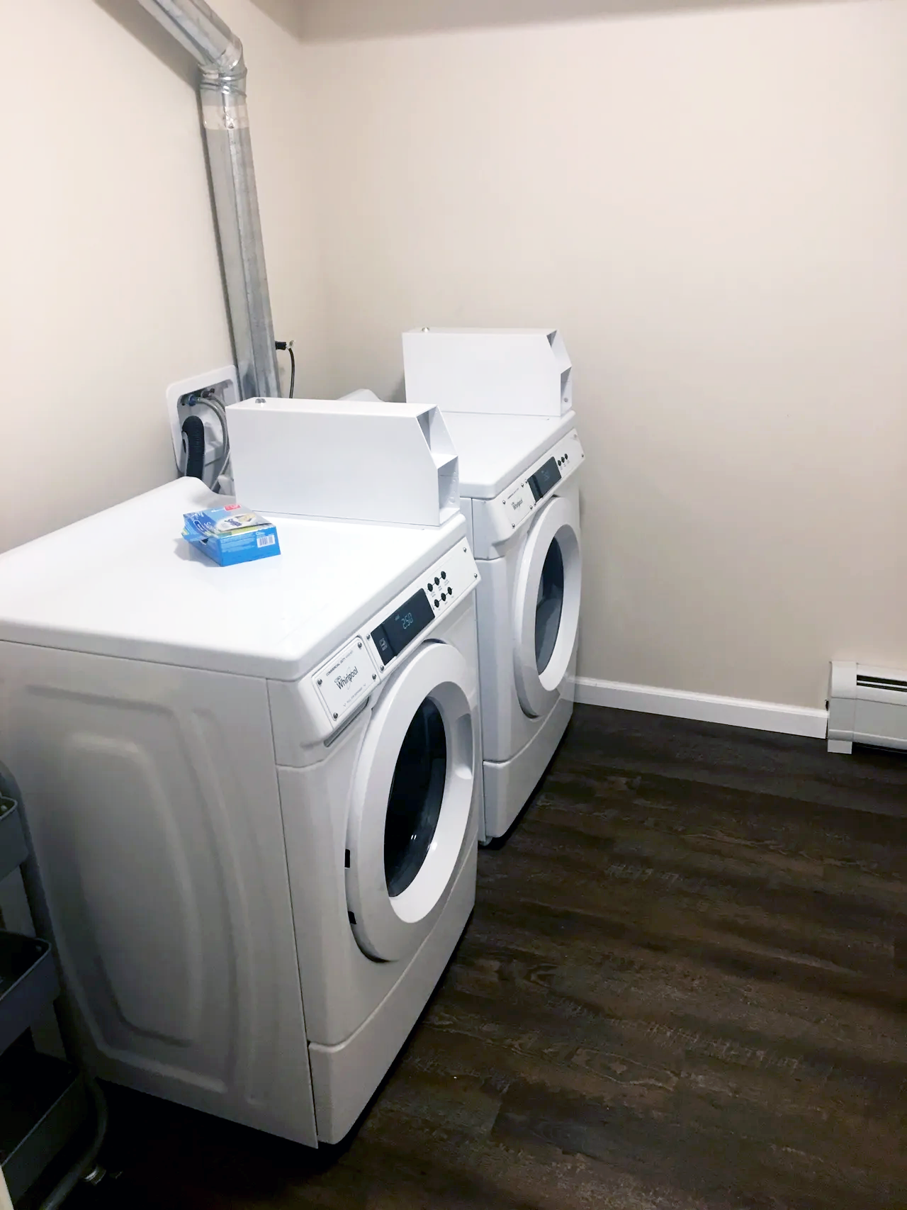 A laundry room with two white front-loading washing machines side by side on dark wood flooring. There is a small item on the left machine's top and a white laundry basket placed on top of the right machine. The wall is beige with a white baseboard, and a metal vent pipe runs from the top left corner down to an electrical outlet on the wall.