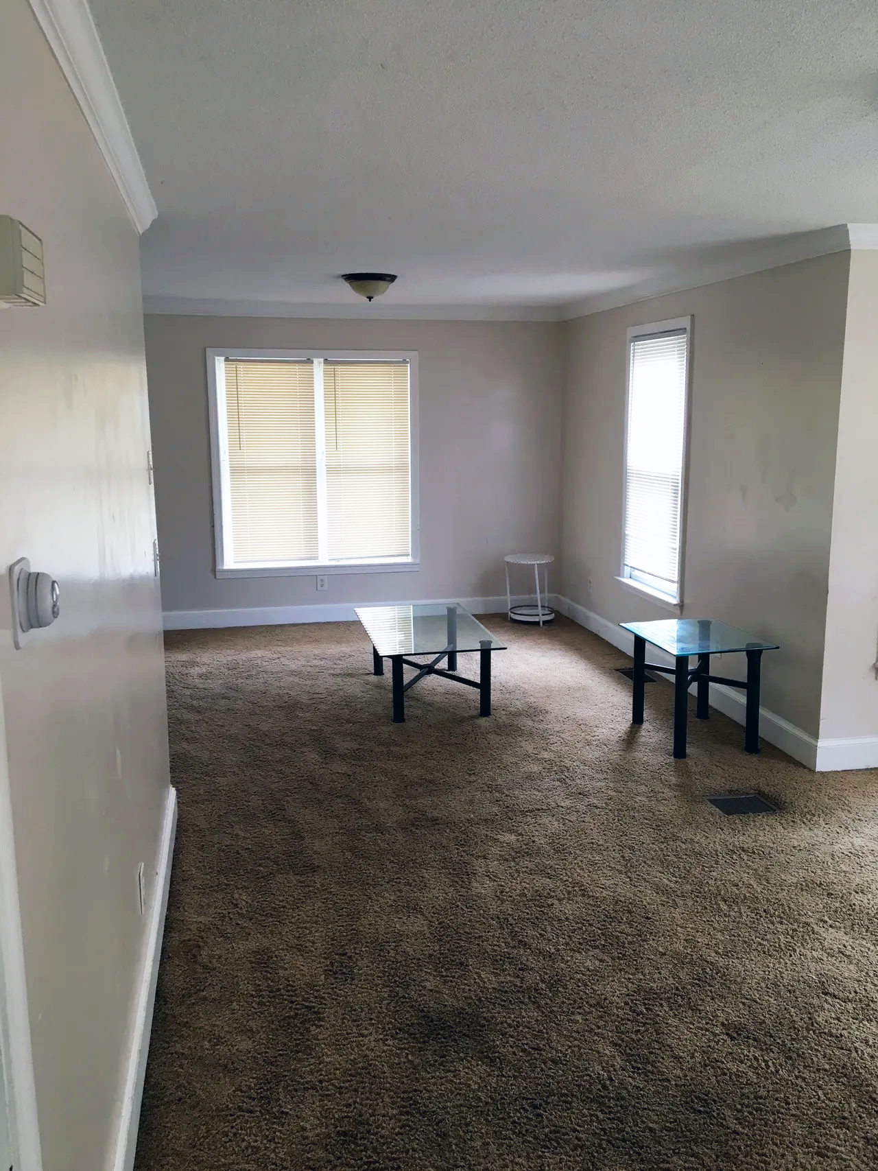 Empty living room with beige carpet, white walls, two windows with blinds, and three glass tables with black legs. One white metal side table is in the corner near the windows.