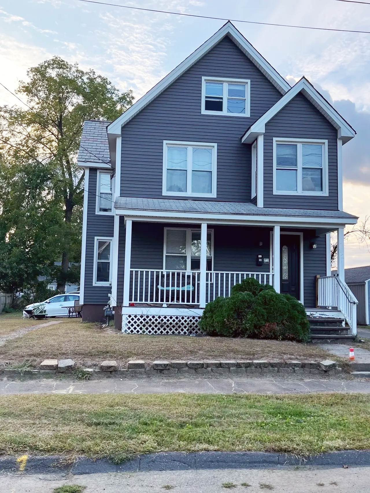 A three-story house with dark gray siding, white trim, and a front porch. The house has multiple windows, a small landscaped front yard, and stairs leading to the entrance. A car is parked in the driveway and there is a tree on the left side.