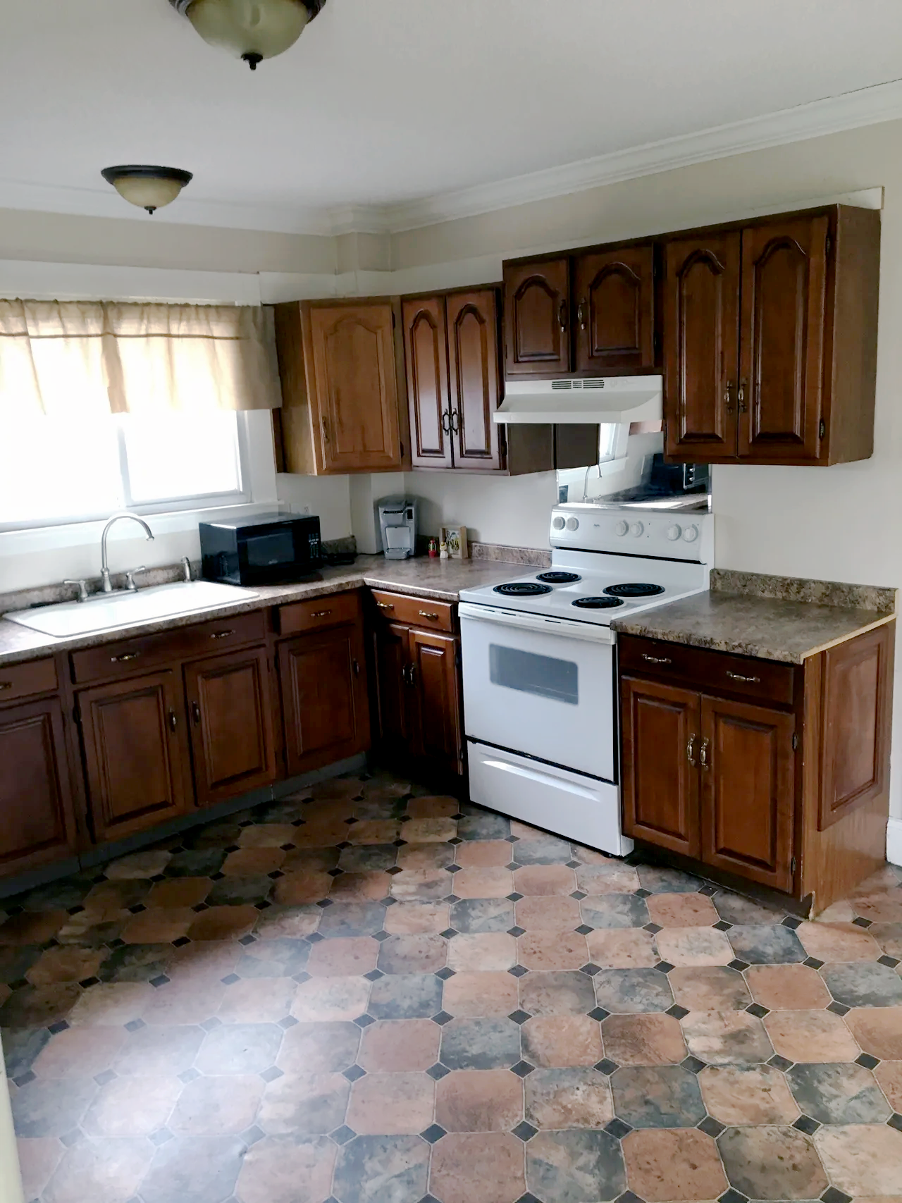 Kitchen with dark wood cabinets, a white stove, a microwave, and a window with beige curtains, hardwood-style hexagonal tile floor.