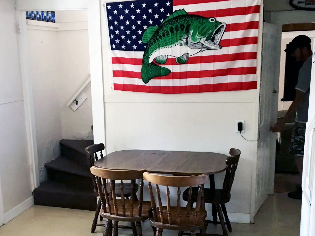 A room with an American flag featuring a bass fish over the stars and stripes. In front, there is a wooden dining table with four chairs. To the left, stairs with dark carpeting lead upward. On the right, a person in a cap and t-shirt is visible by an open doorway.