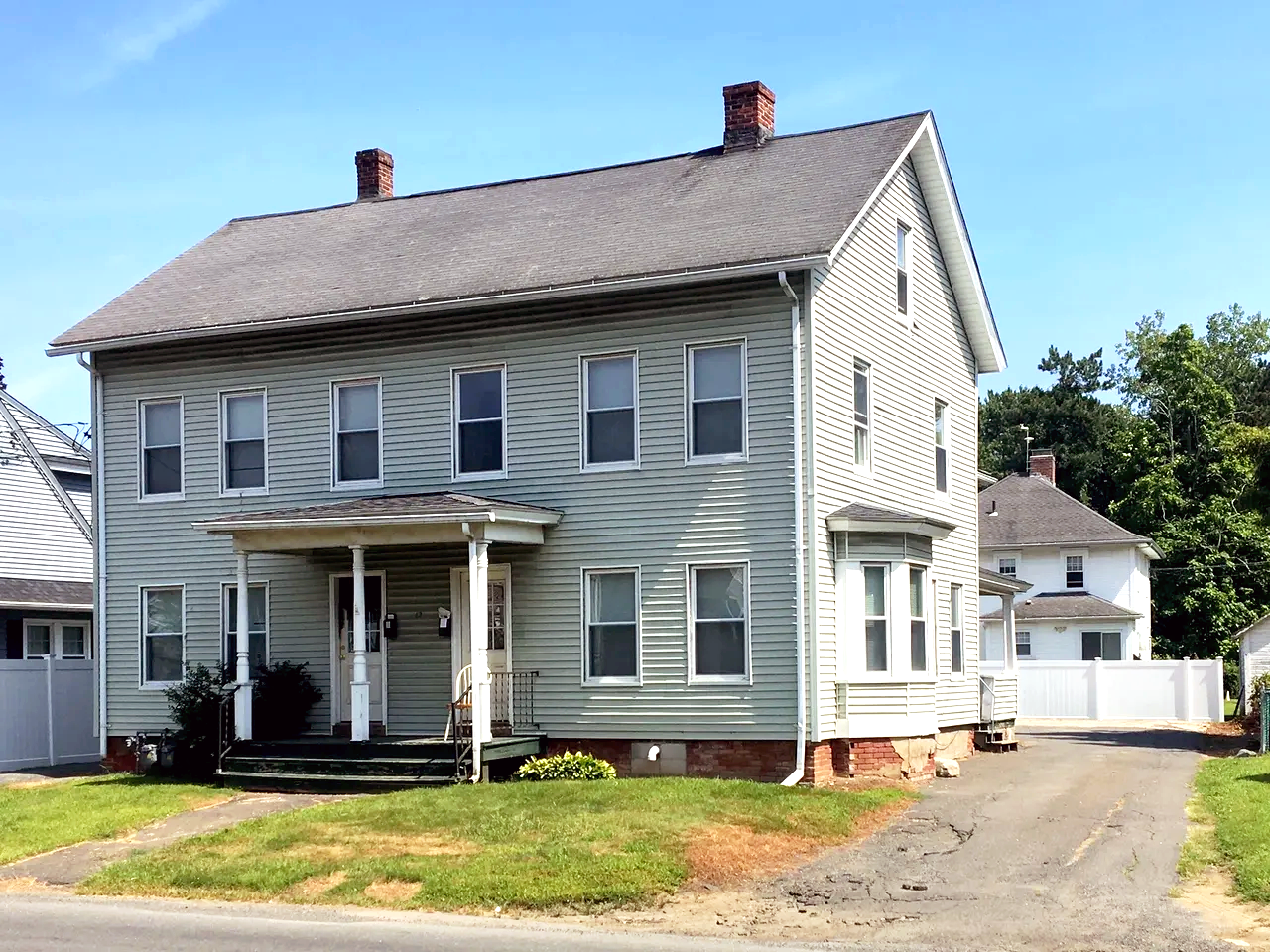 A two-story house with beige siding, a covered front porch, multiple windows, and two brick chimneys, situated on a grassy lot with a driveway.