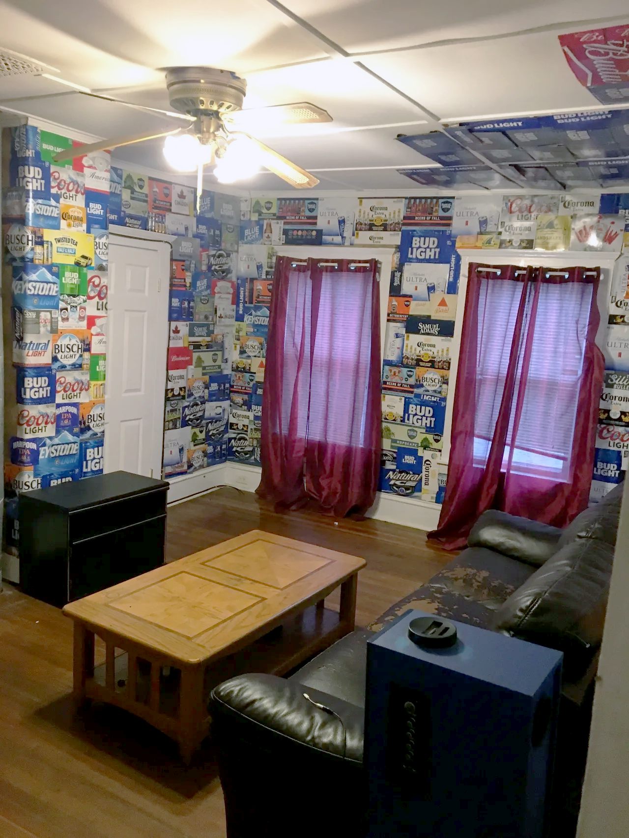 A living room with walls decorated in beer and soda brand advertisements, two windows with red curtains, a black leather couch, a wooden coffee table, and a ceiling fan with lights.