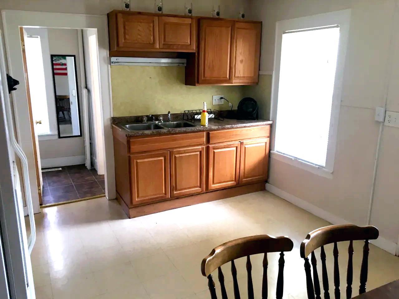 A small kitchen with wooden cabinets, a double sink, and a yellow wall backsplash. There is a window with closed blinds, a black radio, and a bottle of mustard on the counter. A doorway leads to a laundry room with a mirror and an American flag picture on the wall.