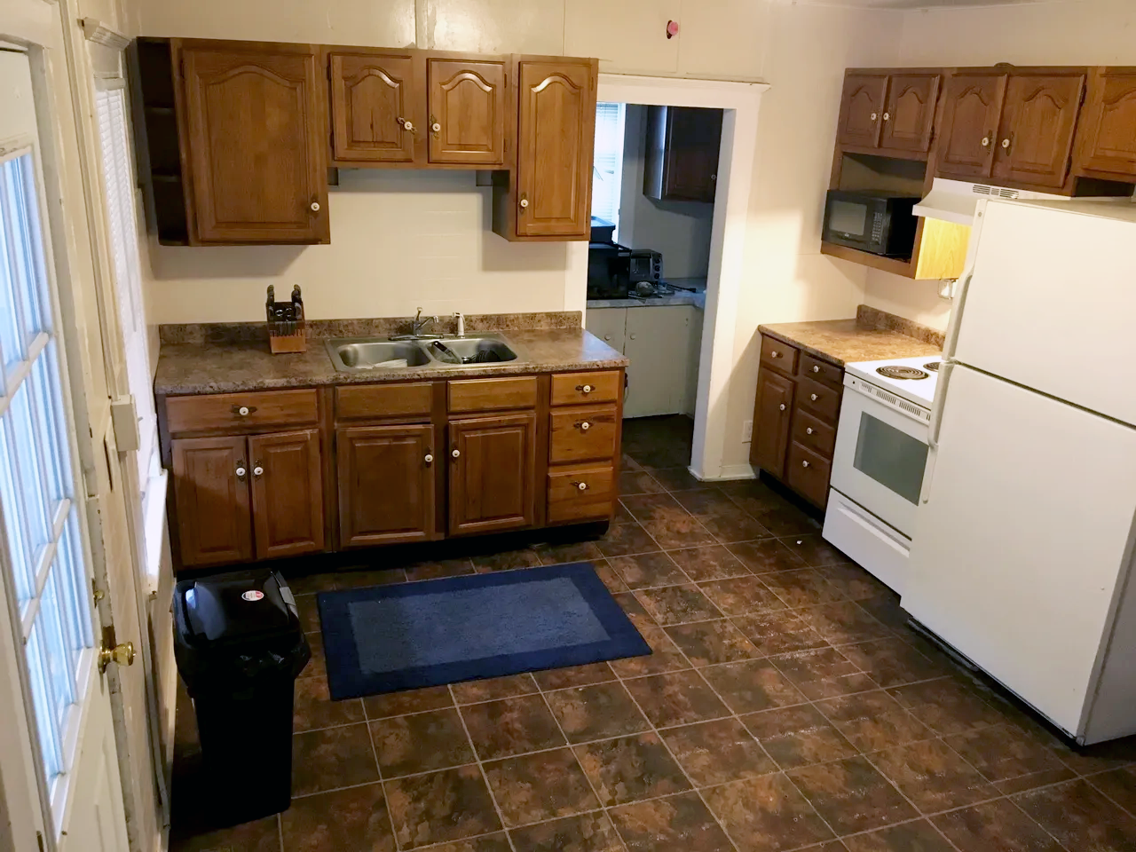 Kitchen with brown wooden cabinets, a white refrigerator, an electric stove, a microwave, a small kitchen counter, a sink, and a blue rectangular rug on a brown tiled floor.
