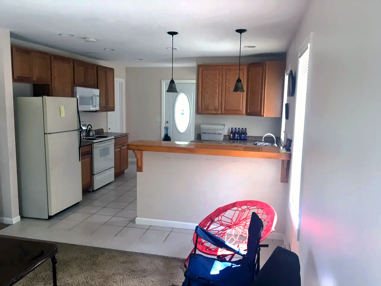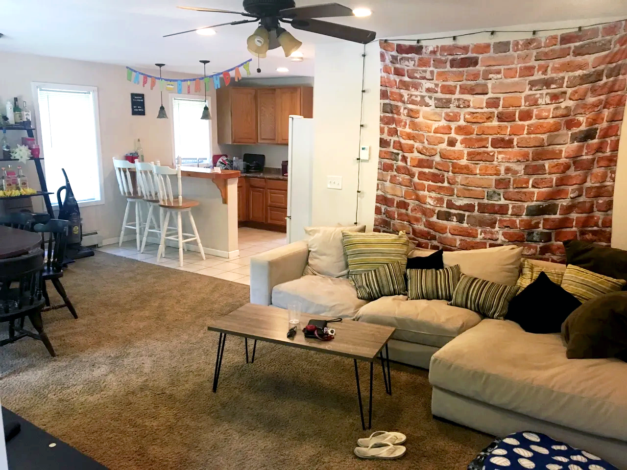 Living room with an L-shaped beige sofa, multiple striped and solid colored pillows, a small wooden coffee table with keys and a glass on it, a brick wall backdrop, and a ceiling fan overhead. Adjacent to the living area is an open kitchen with wooden cabinets, a white refrigerator, and a bar with two white chairs. There is a birthday banner hanging from the ceiling, and a window with blinds.
