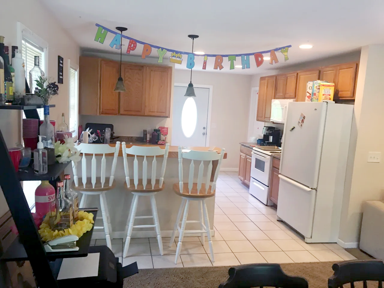 Kitchen decorated for a birthday celebration with a colorful "Happy Birthday" banner hanging from the ceiling, a white refrigerator, wooden cabinets, a stove, and three white chairs at a kitchen island.