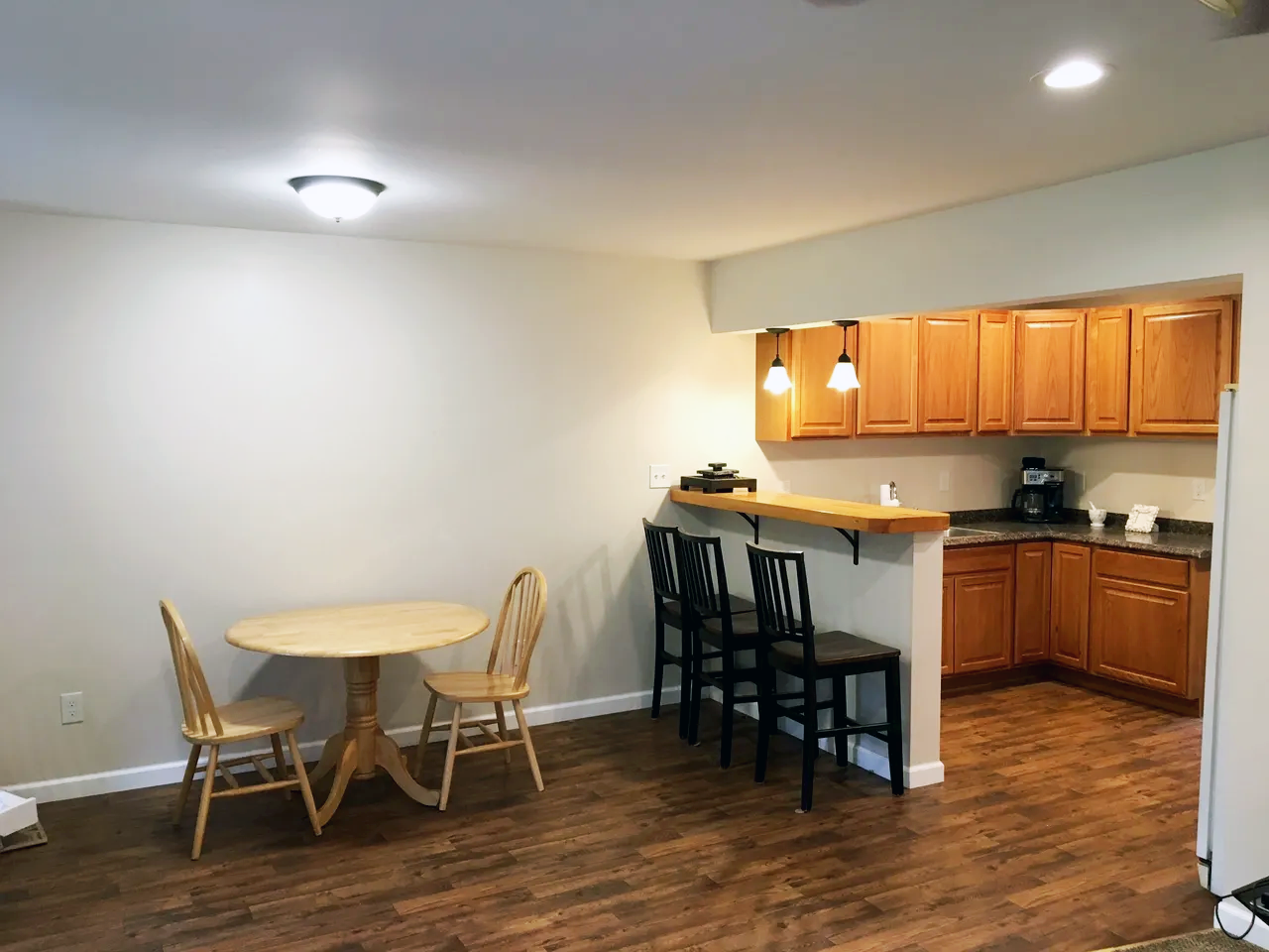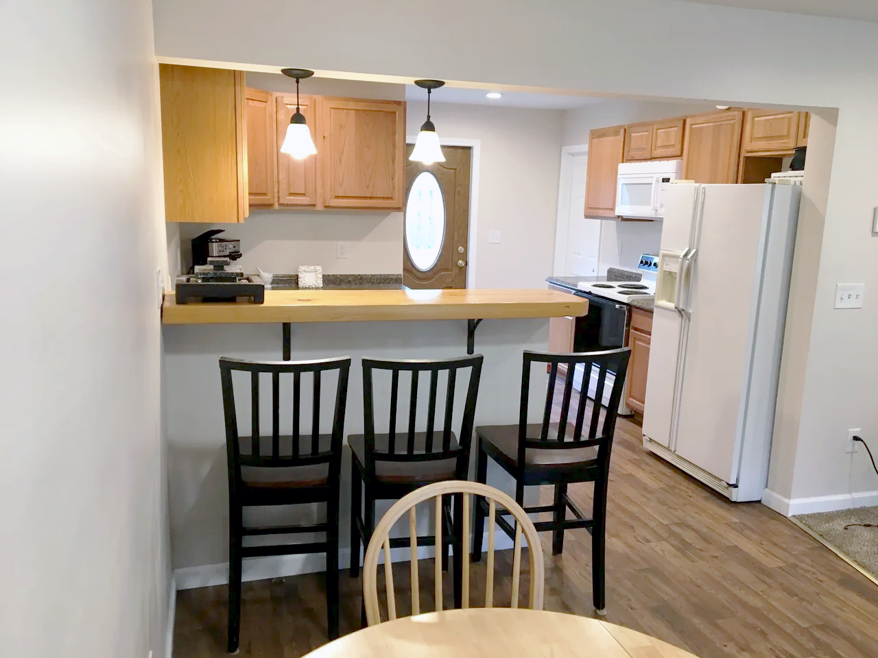 Kitchen with wooden cabinets, white refrigerator, and stove. There is a breakfast bar with three black chairs and a dining table with wooden chairs. Two hanging lights above the bar and a door with an oval window in the background.