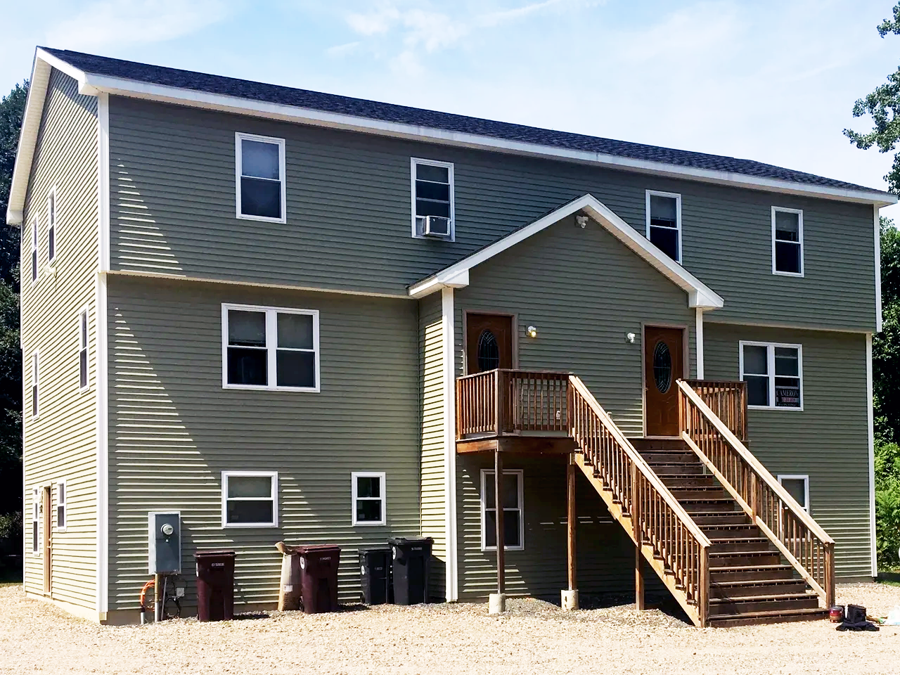 Three-story green house with brown front stairs, outdoor lighting, multiple white-framed windows, and an air conditioning unit in one of the upper windows, surrounded by gravel ground and some garbage bins.