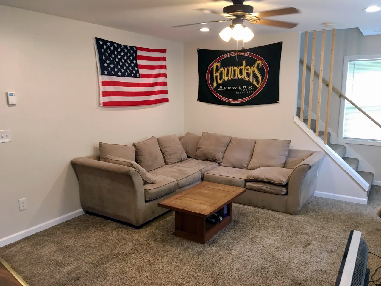Living room with beige sofa, wooden coffee table, American flag and Founders Brewing flag on white walls, ceiling fan, staircase with carpeted steps, window with blinds, and beige carpet.