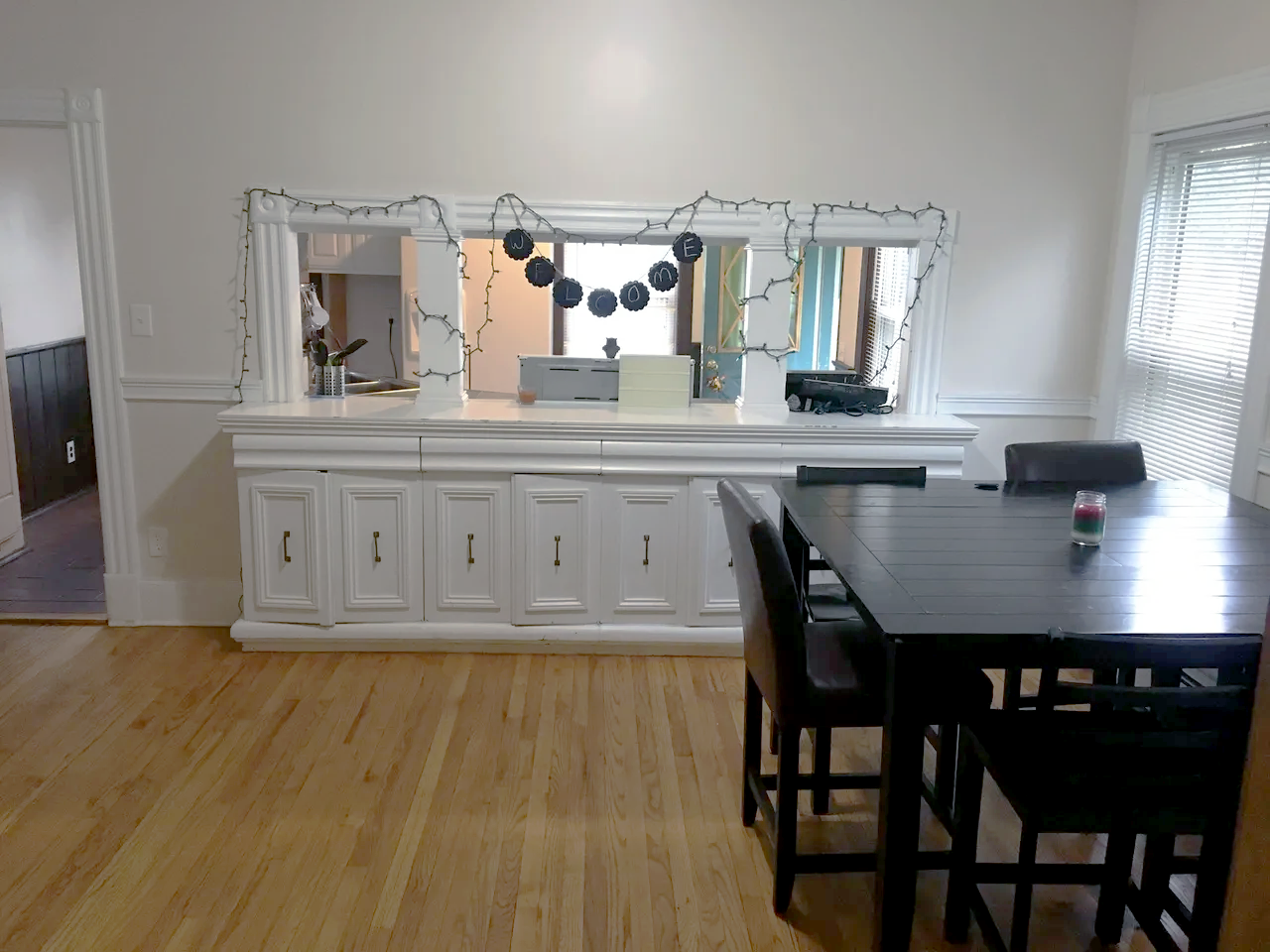 Dining area with a black table and four chairs, a candle on the table, a white cabinet with a mirror above decorated with string lights and a banner, window blinds on the right, and a nearby doorway.
