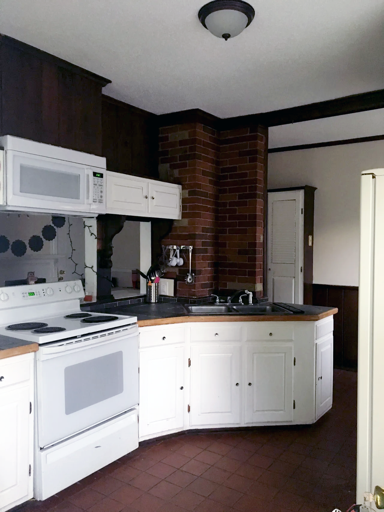 Kitchen with white cabinets, a white oven and microwave, a double sink, and a brick chimney wall.