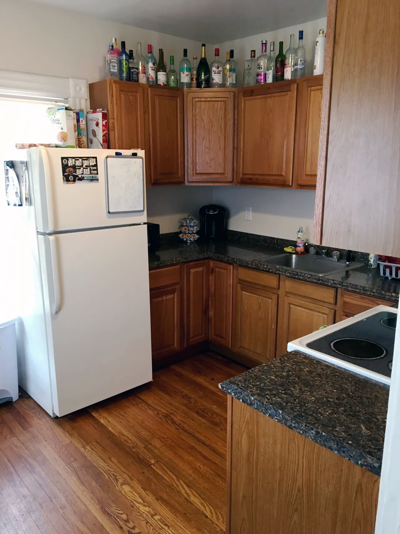 Kitchen with wooden cabinets, white refrigerator, black coffee maker, sink with soap, stove, and wooden flooring. Bottle collection on top of cabinets.