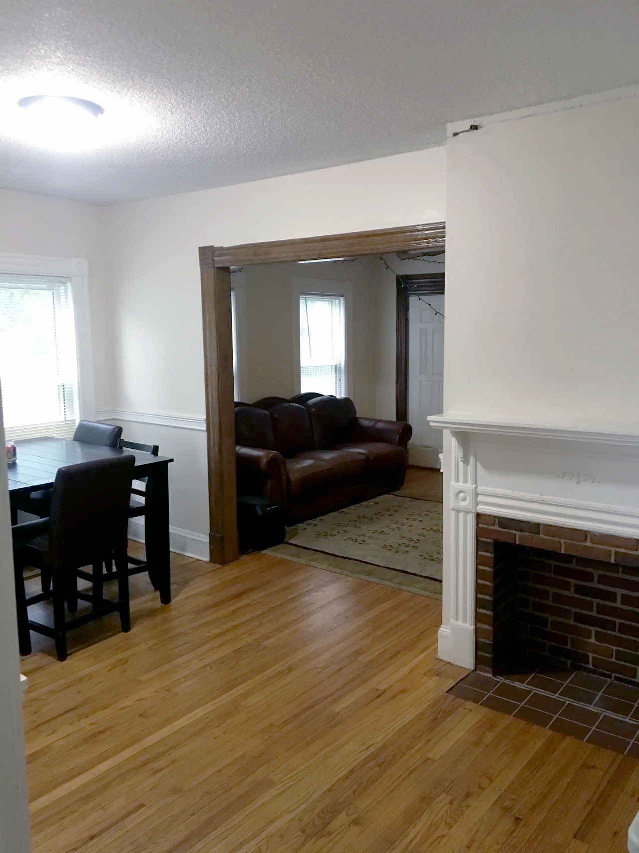 The image shows a glimpse into a living room with hardwood floors, a white wall, and a ceiling light. There is a doorway with wooden trim leading to another room, where a brown leather couch and two windows are visible. There is a fireplace with a white mantel and brick interior on the right side of the image.
