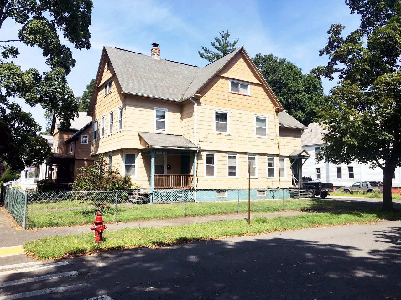 A yellow, three-story house with multiple windows, a small front porch, a gabled roof, and some trees in the yard. It has a chain-link fence and a fire hydrant in the foreground.