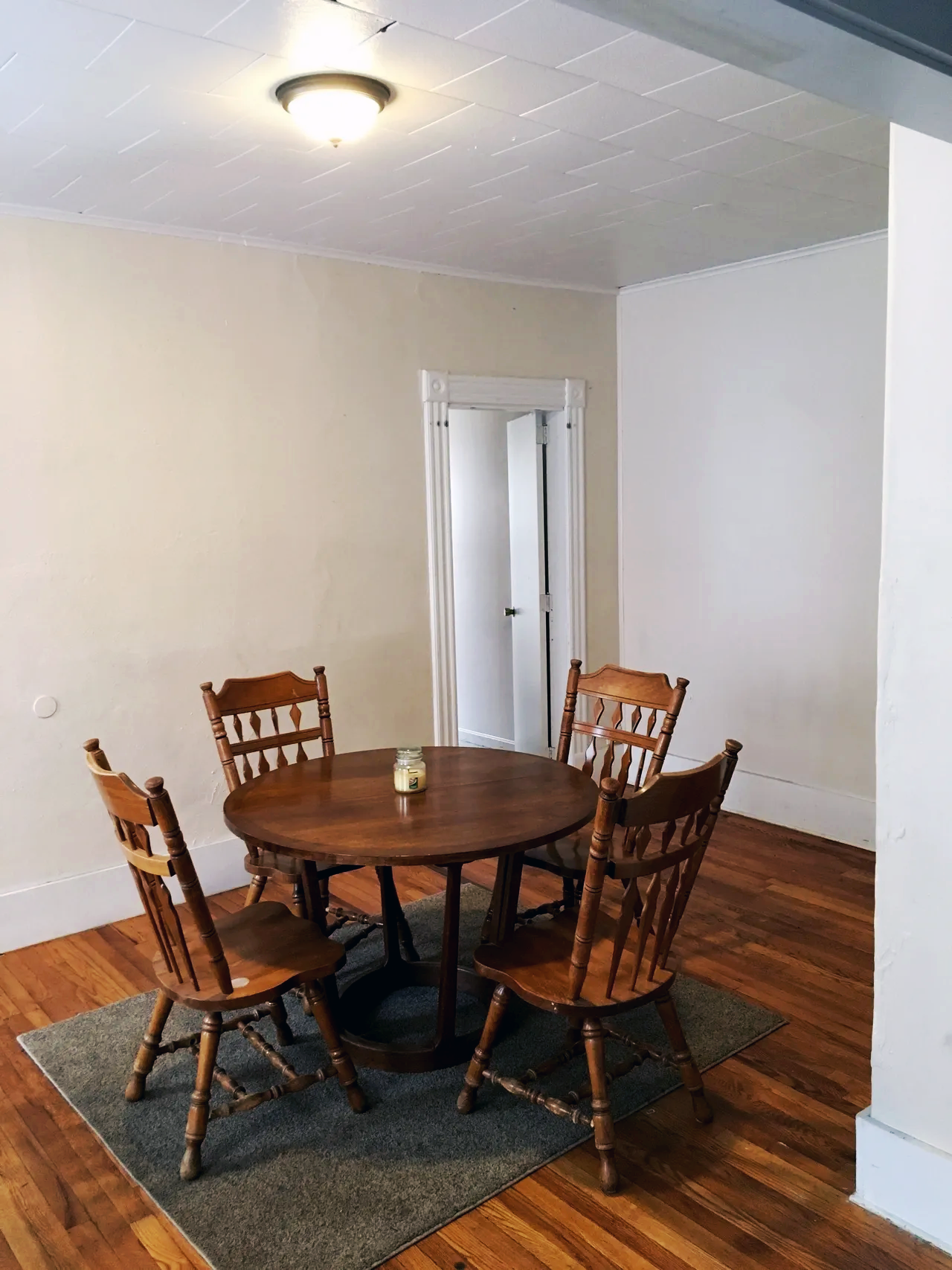 A dining room with hardwood floors, a round wooden table, four matching wooden chairs, a small candle on the table, a doorway at the back, and a ceiling light fixture.