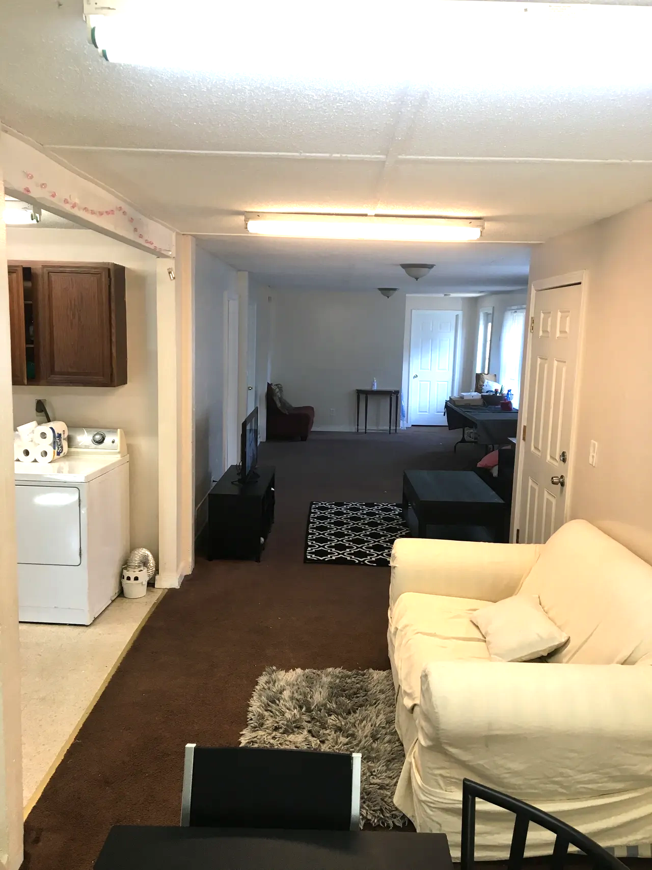 A living room view showing a white sofa with two pillows, a dark coffee table, a black and white patterned rug, a TV on a stand, a small table near the door, and windows in the background. To the left, part of a laundry area with a washer and dryer, and wooden cabinets above.