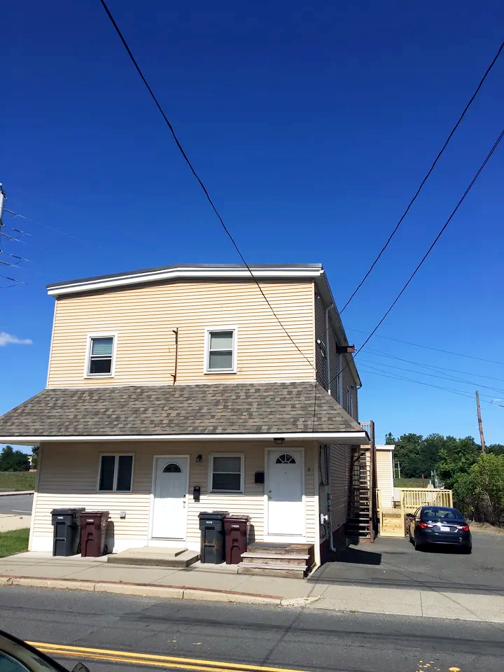 Two-story beige building with two doors on the ground floor, each with a small porch and steps, and two windows on the upper floor. Several trash bins are on the sidewalk outside, and a car is parked to the right. Power lines cross above the building under a clear blue sky.