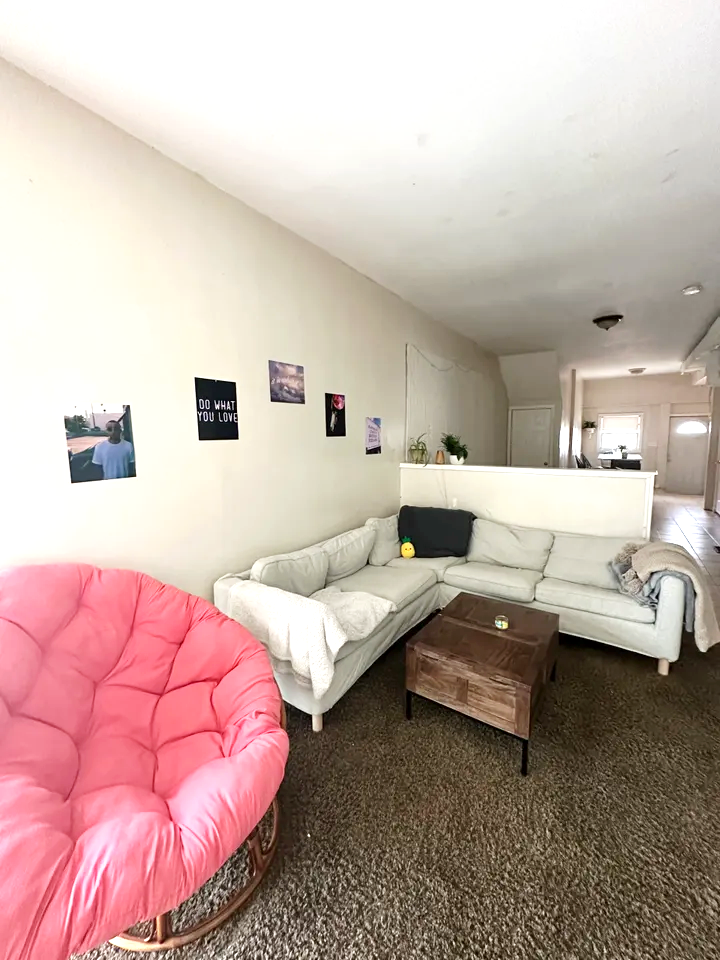 Living room with a pink cushioned papasan chair, a white L-shaped sectional sofa with a blanket and throw pillow, a small wooden coffee table, and wall decorations including photos and motivational quote.