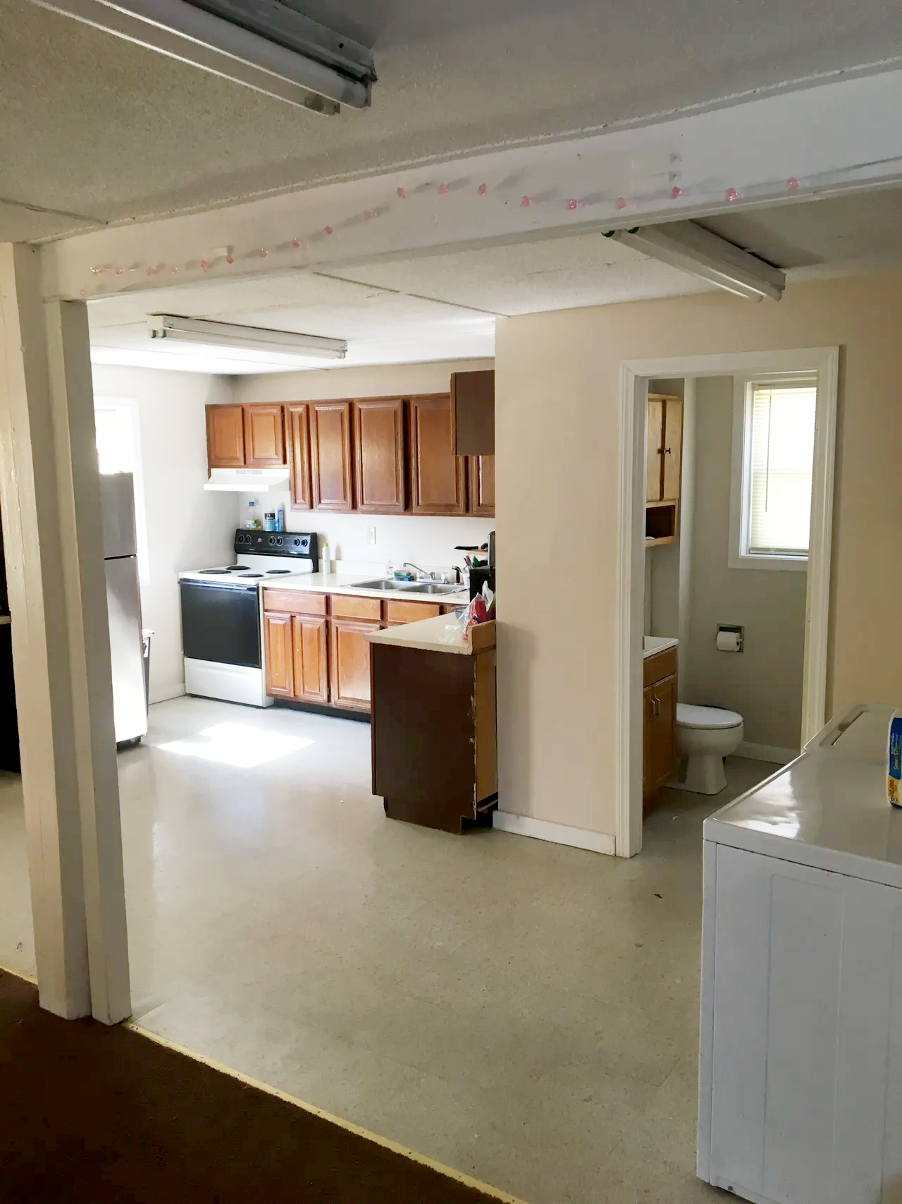 A kitchen and bathroom with visible appliances, cabinets, and a window, with a laundry machine in the foreground.
