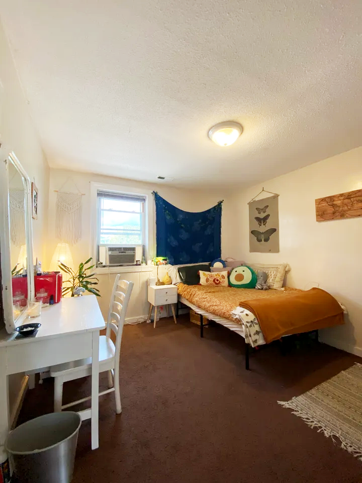 A cozy bedroom with a bed, pillows, and blanket, a small nightstand, a desk with a mirror and chair, a window with an air conditioning unit, and wall decorations.