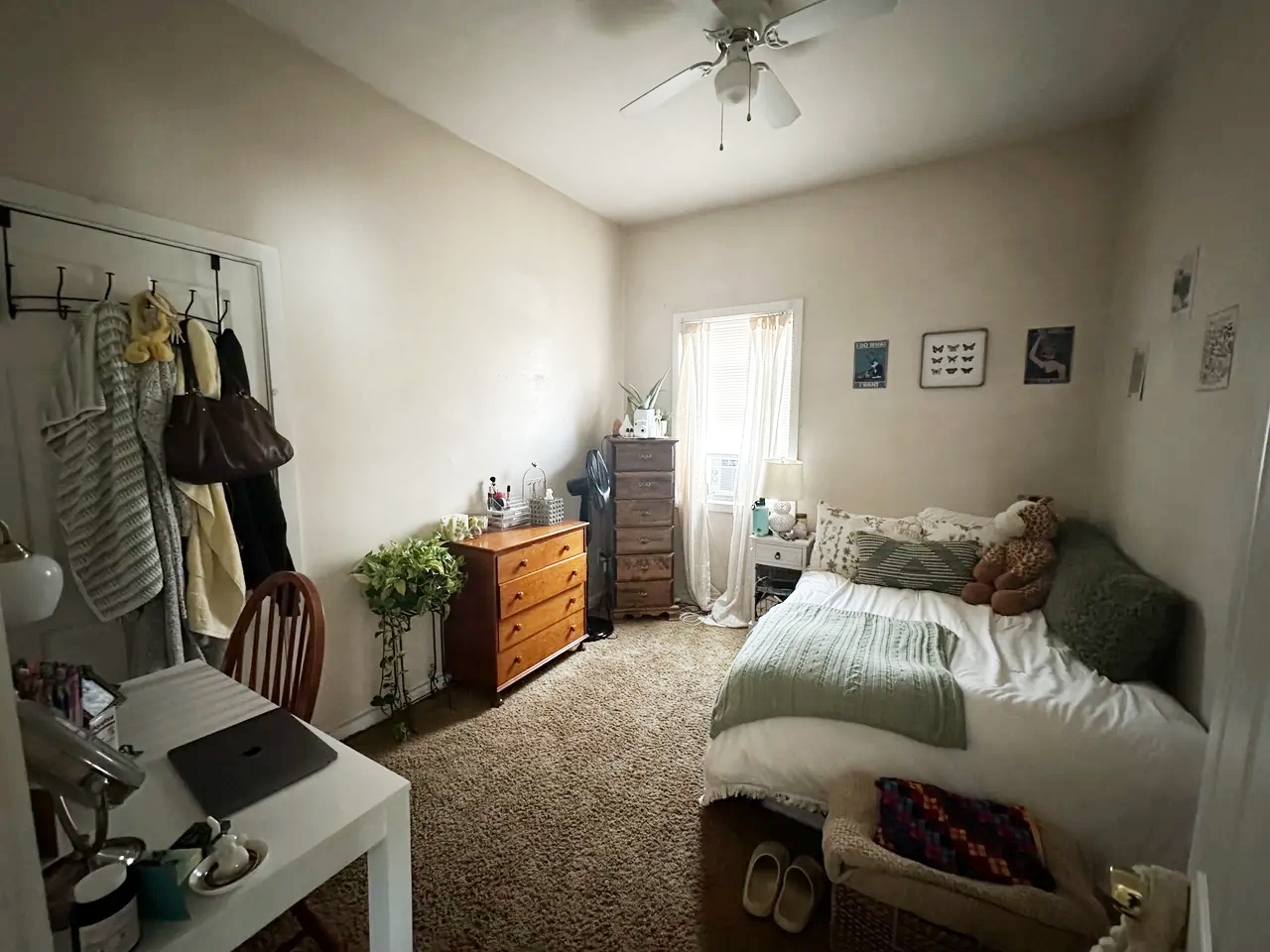 A bedroom with a bed, window, dresser, and various decorations, including stuffed animals and framed pictures on the wall.