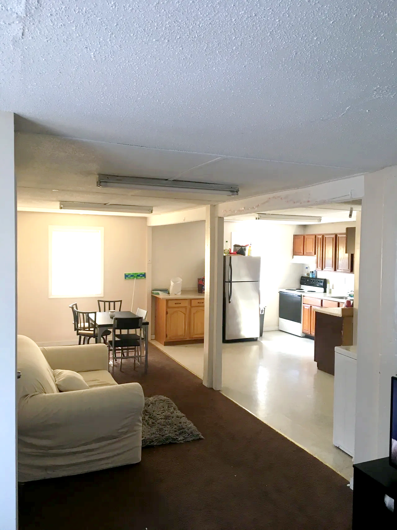 An open-plan living and dining area with a white sofa on a brown carpet, a dining table with four chairs, a window with bright light, and a kitchen with wooden cabinets, a black stove, and a refrigerator.