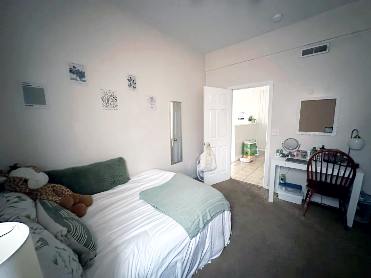 A cozy bedroom with a bed featuring stuffed animals, decorative pillows, and a blanket. The wall above the bed has small framed pictures. There is a door open to a hallway or bathroom, where a stack of paper towels and some items are visible. A mirror hangs on the wall next to the door. On the right side, there's a white desk with a mirror, some toiletries, a lamp, and a wooden chair.