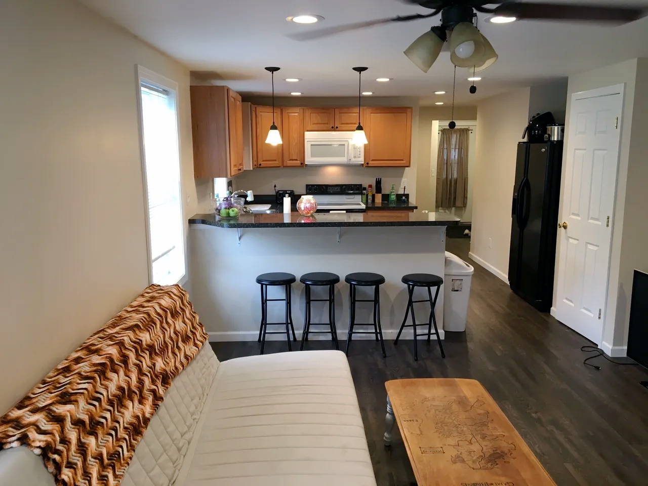 Kitchen and living room area with a bar counter, four black stools, wooden cabinets, white microwave, black stove, black refrigerator, ceiling fan, beige walls, white couch with a patterned blanket, small wooden table, and various kitchen items.