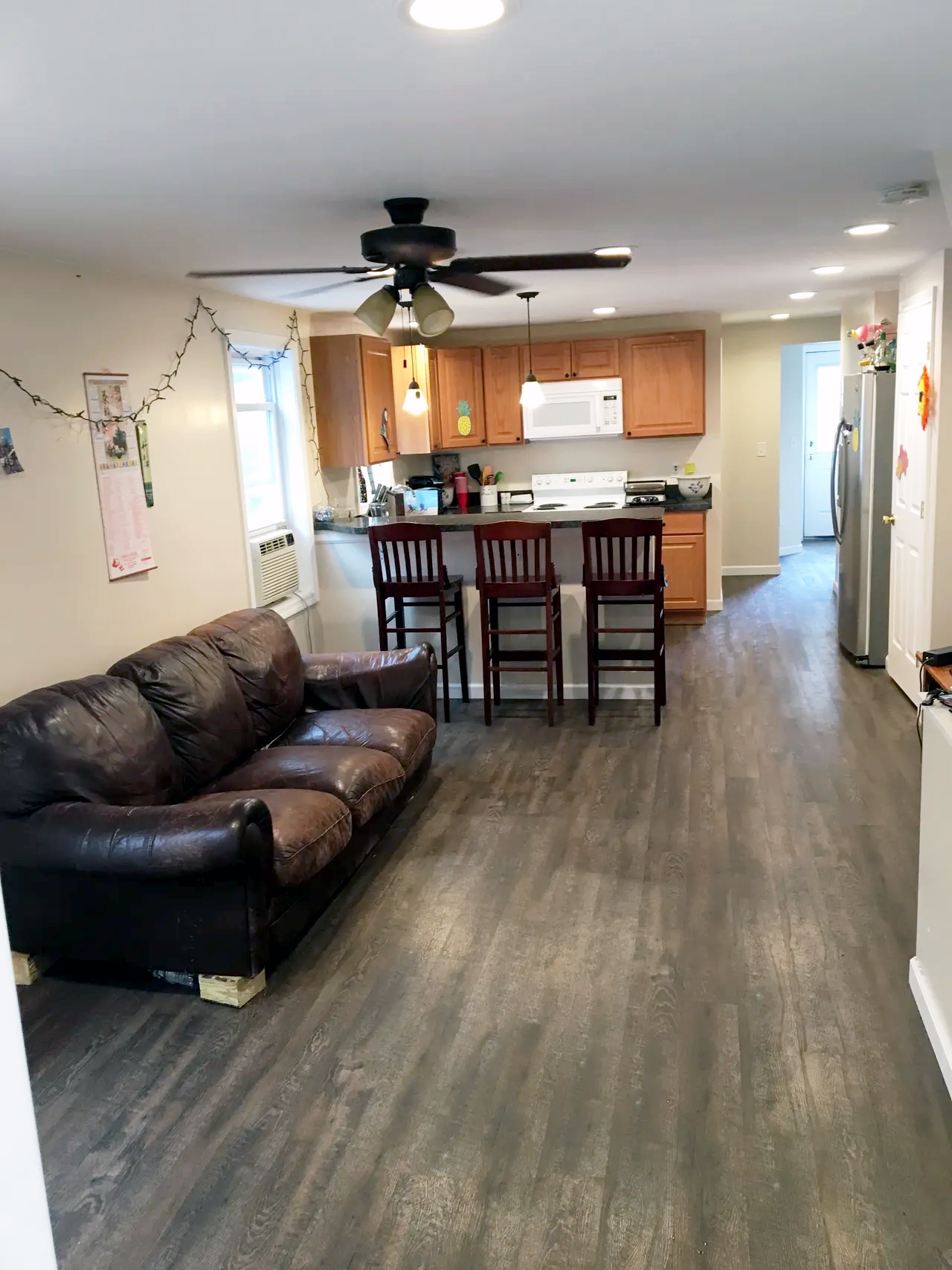 Living room with leather sofa, kitchen with wooden cabinets, white appliances, and four barstools at the counter, ceiling fan, and string lights on the wall.