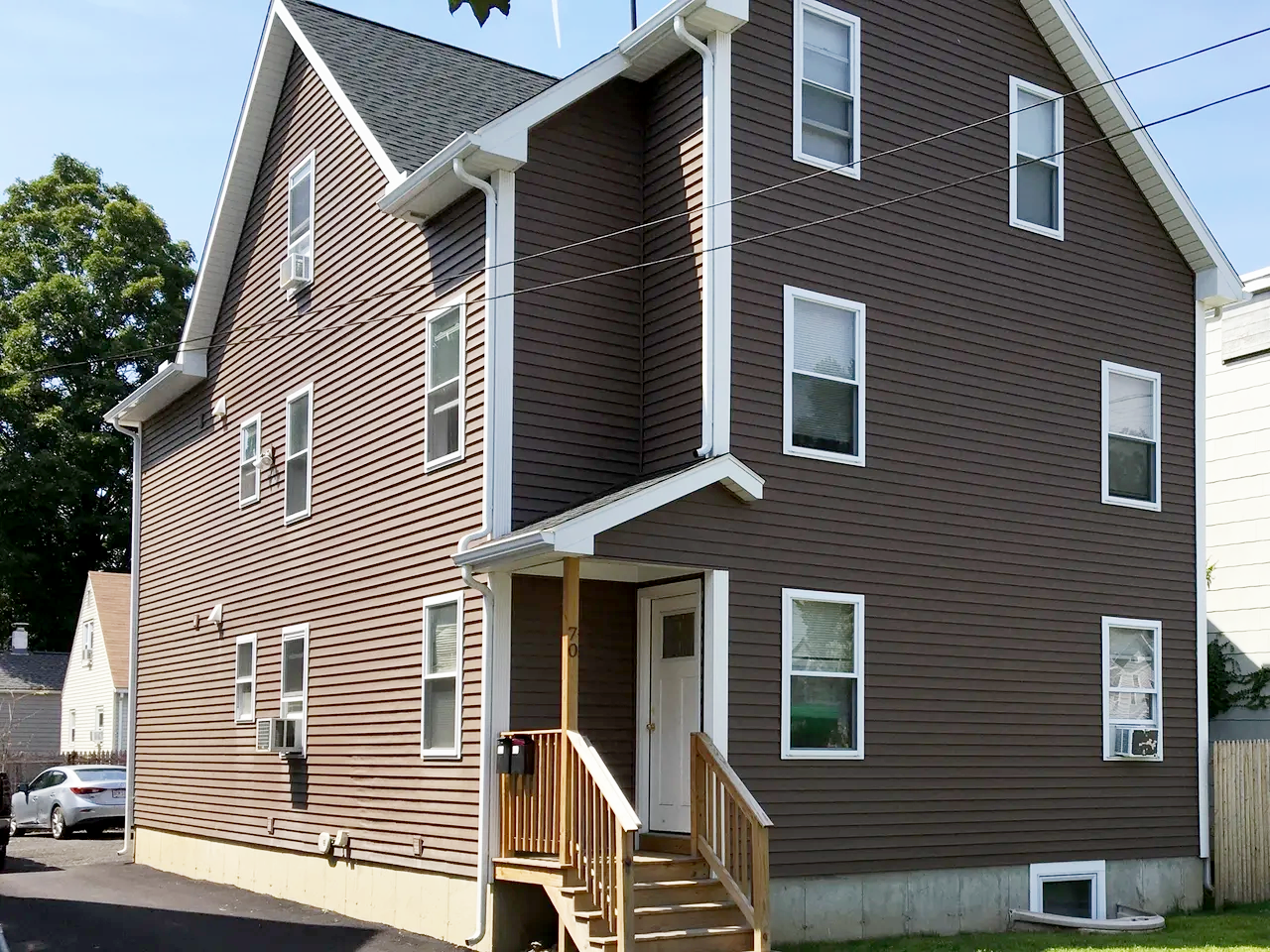 Brown multi-story house with white trim and stairs at the entrance, surrounded by a small driveway and neighboring houses, with blue sky overhead.
