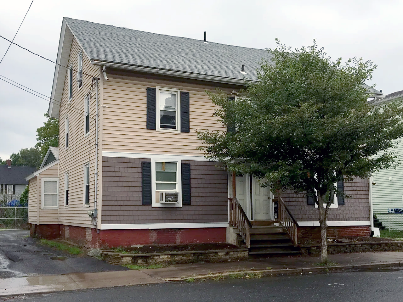 A two-story house with beige and brown siding, black shutters, a small front porch with steps, and a tree in front of it on a wet sidewalk and street.