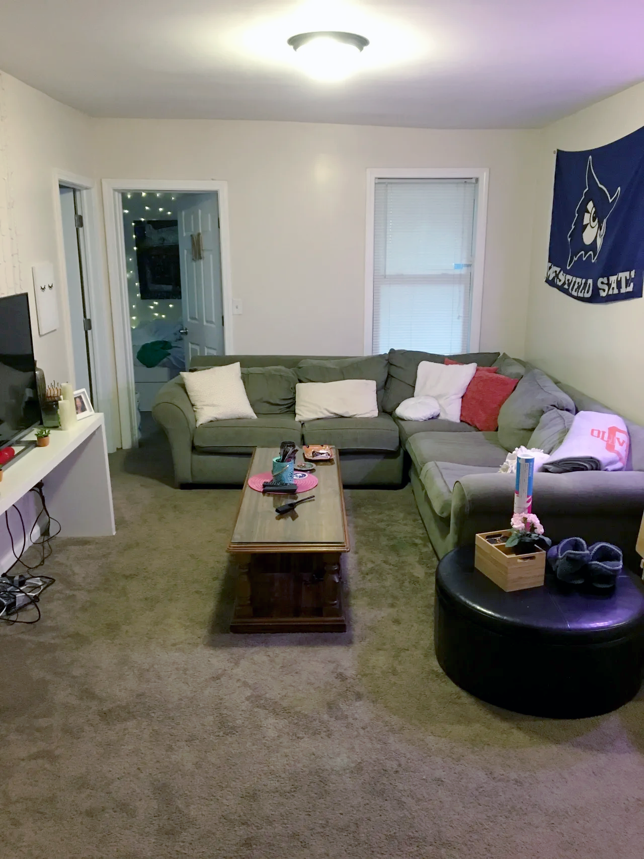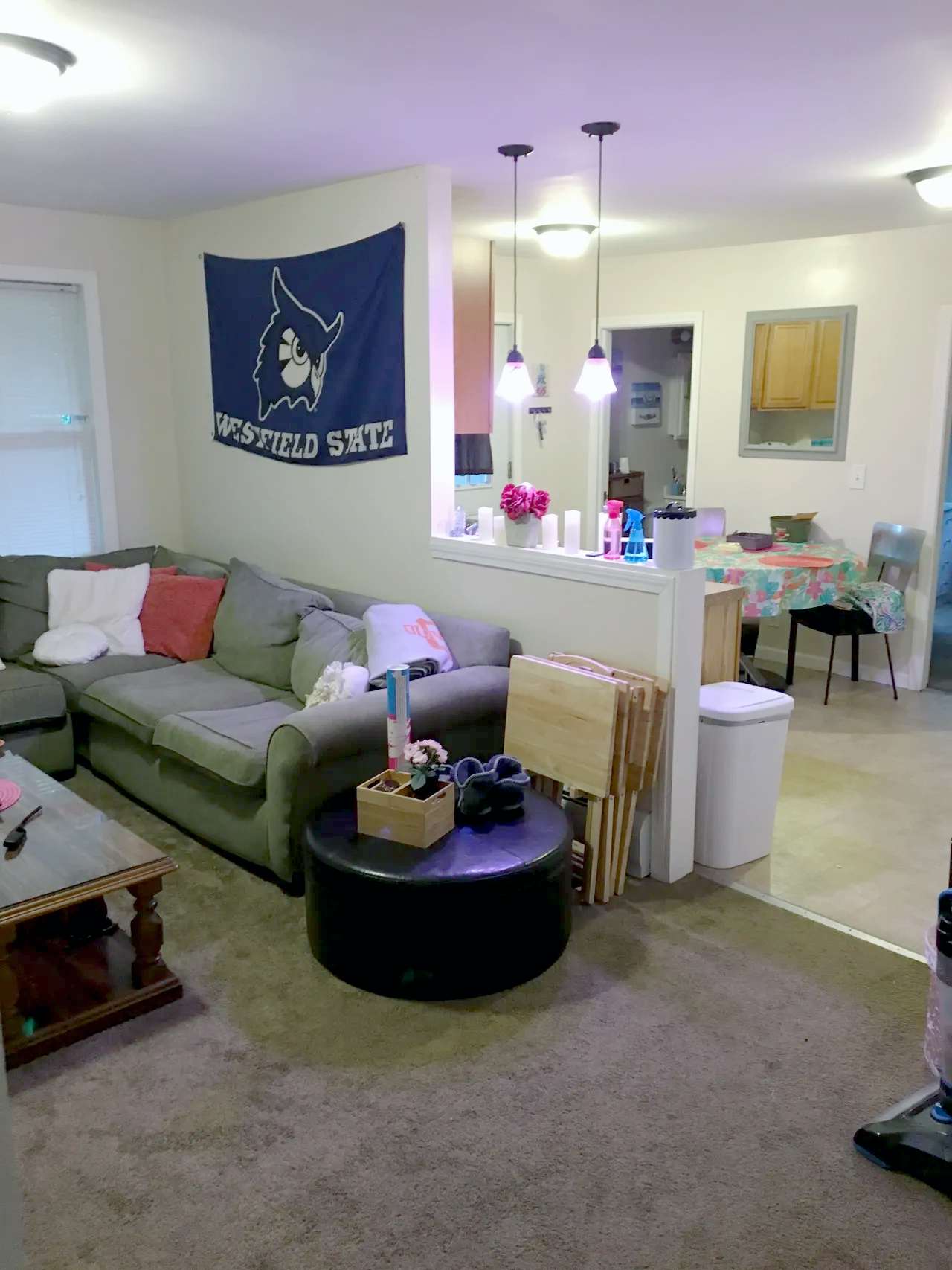 Living room with gray couch, wall banner that says 'Westfield State', coffee table, and a separate dining area with a table covered in a colorful tablecloth.