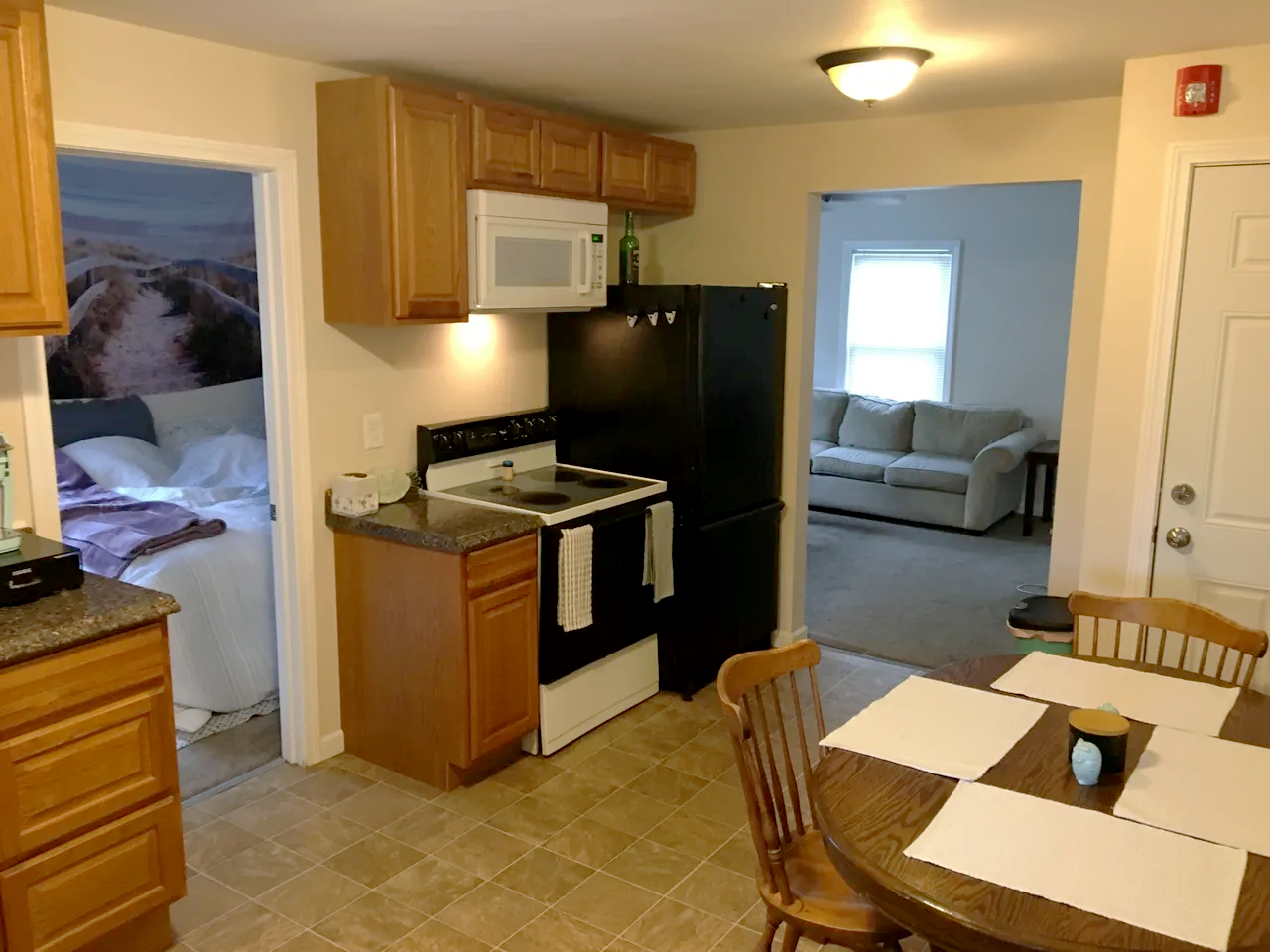 A cozy kitchen and dining area with wooden cabinets, a white microwave, a black refrigerator, a stove, and a dining table with four place mats and a small container, with a view into a living room with a beige sofa.
