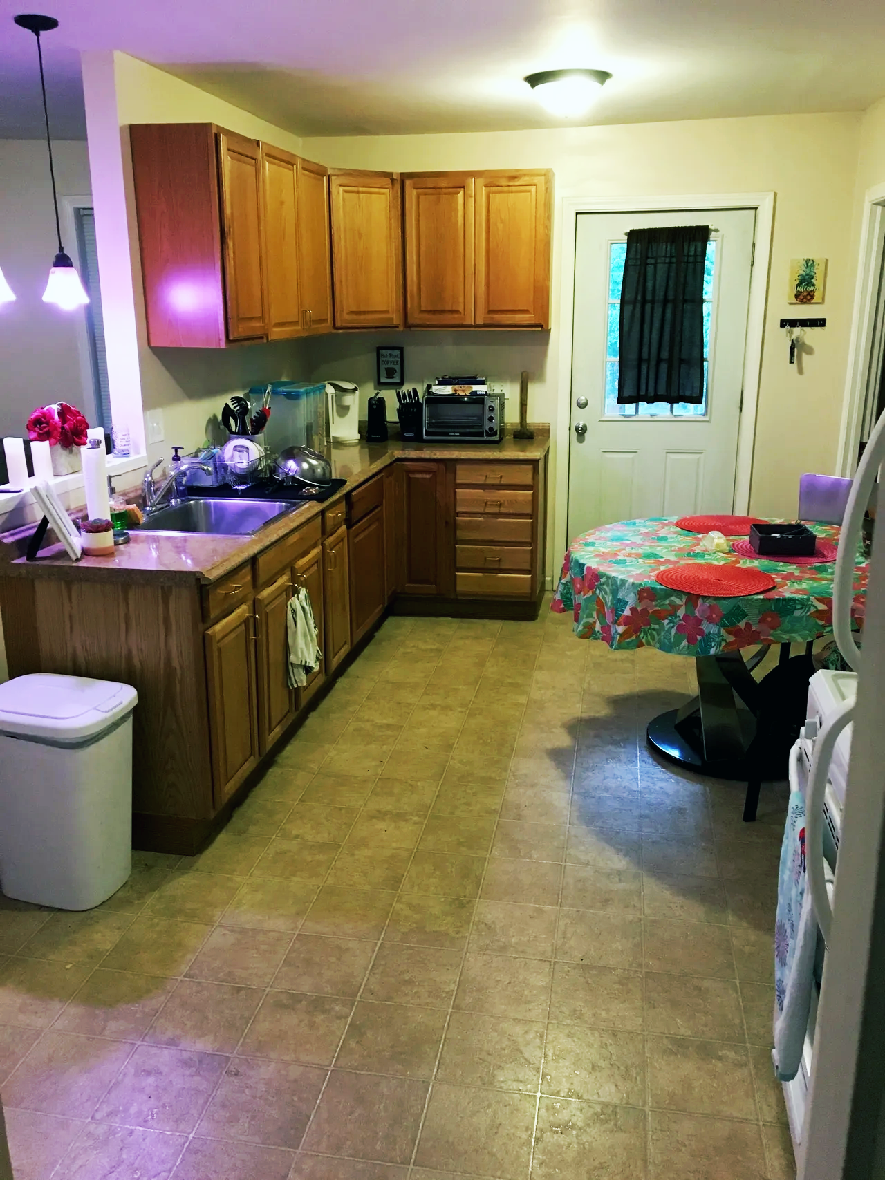 Kitchen with wooden cabinets, beige countertops, a stainless steel sink, a small table with a floral tablecloth, and a door with a small window and dark curtain.